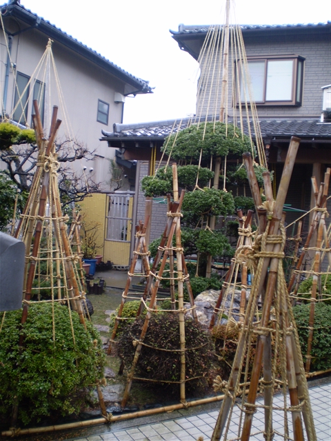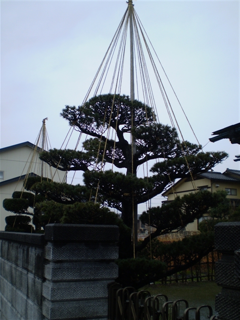 ここ数年来の暖冬で、雪吊りをしない家も増加してきましたが、庭木を囲むことで寒さから守ることができます。