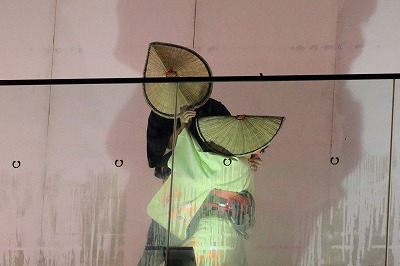 男踊りでは、案山子のような恰好をした男の人が、ポーズを1分ほど取り、その間、右側の人が踊り続けます。