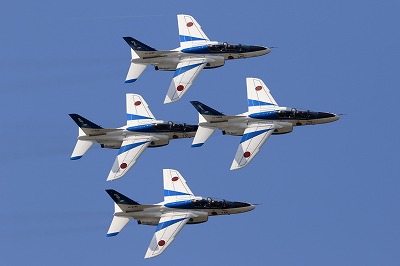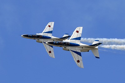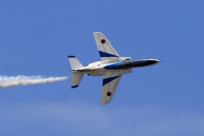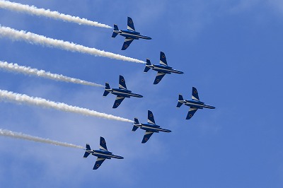 続いては、航空祭のメインイベント、ブルーインパルスです。言わずと知れた三沢基地所属のT-4練習機。今年の春にエンジンのトラブルがあり、全機飛行中止になっていたのですが、夏前にやっと修理が完了し、今年初めての6機でのフライトとなったそうです。