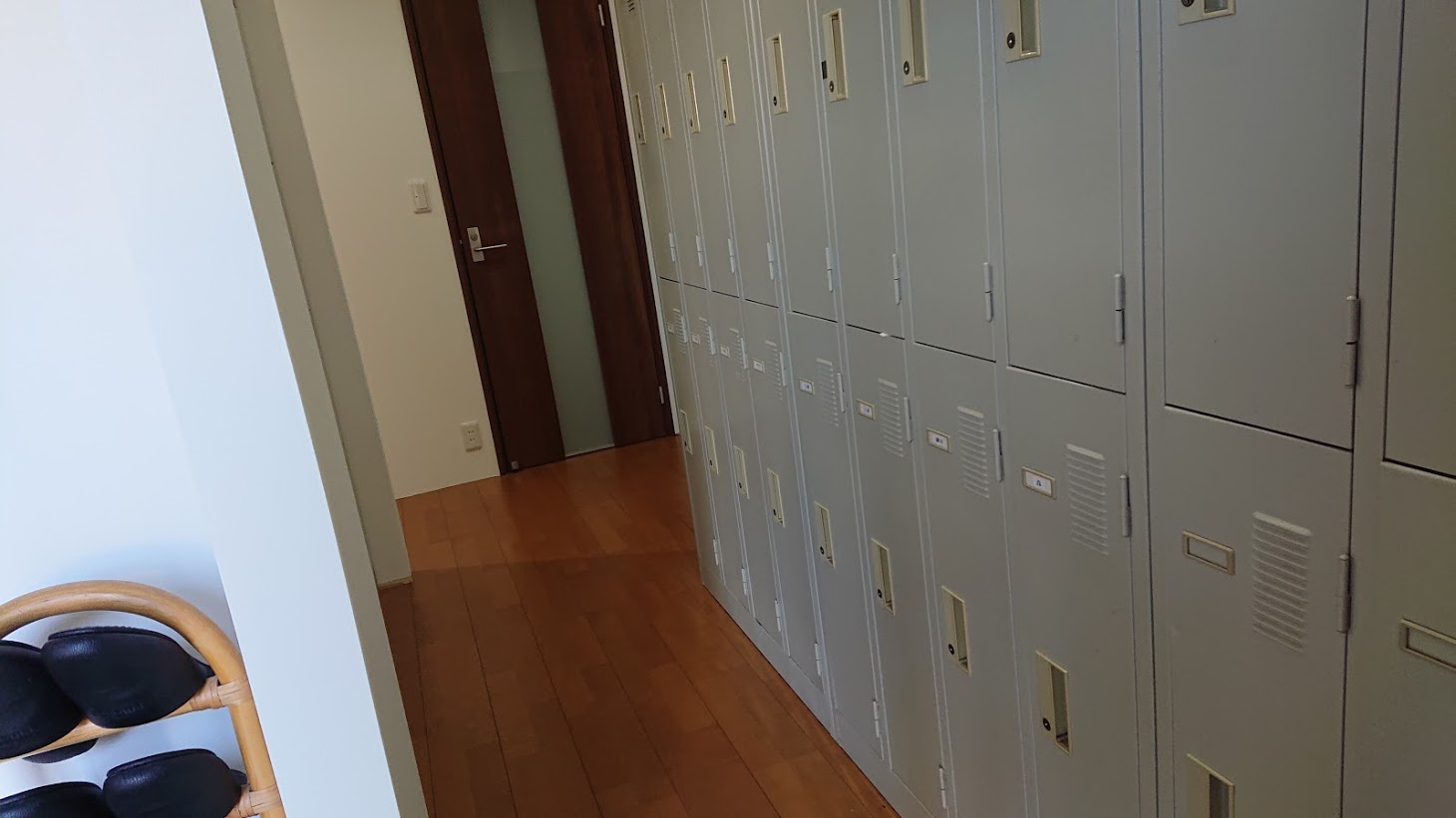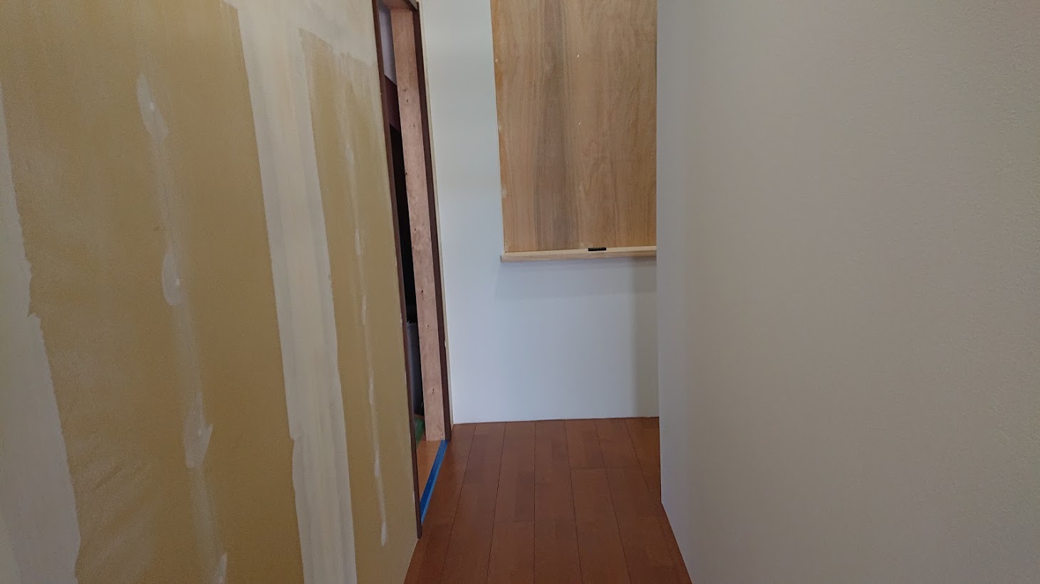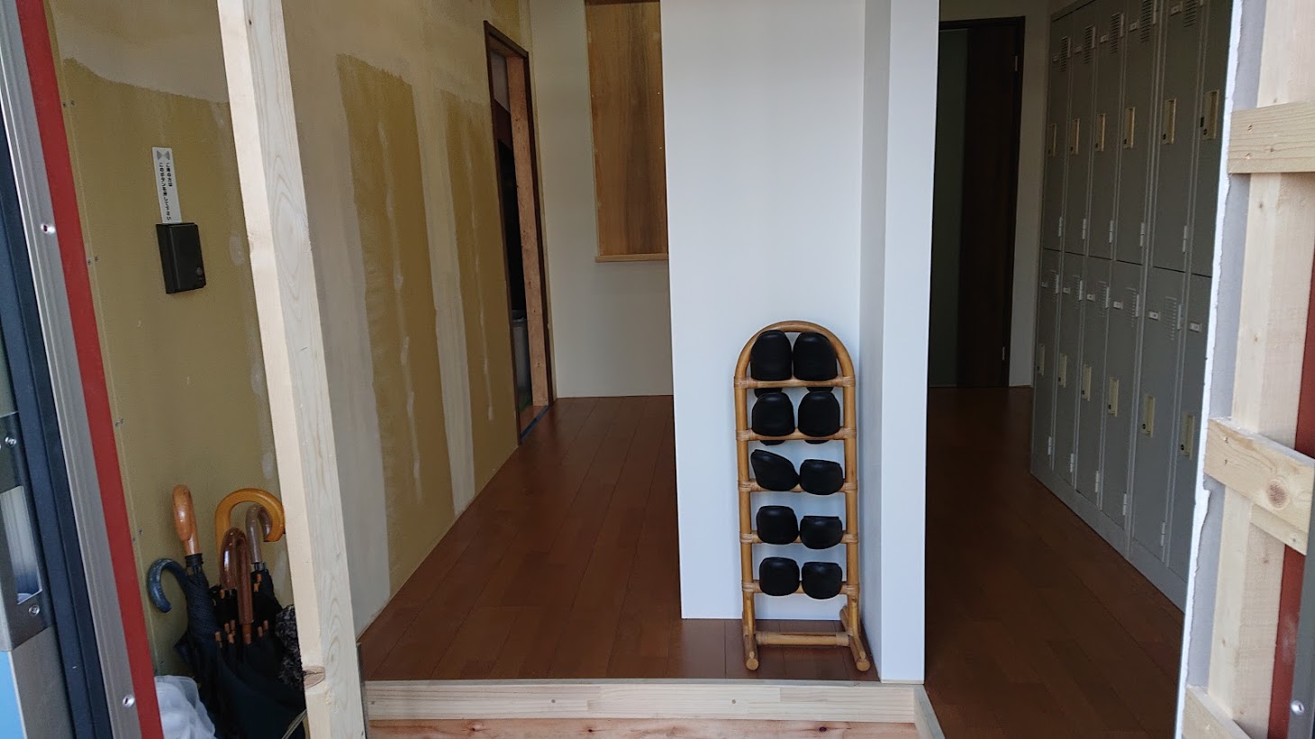 右側は社員用玄関で、ロッカーが並んでいます。左側がお客様の通路。壁紙がまだ貼られていませんし、左奥のドアもまだ取り付けられていません。