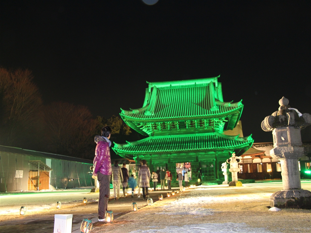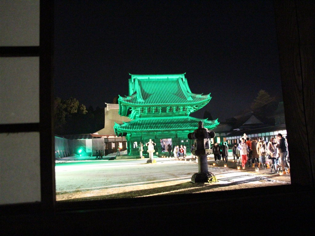 山門や本堂に光を当て、その光が様々な色に変わるということ。