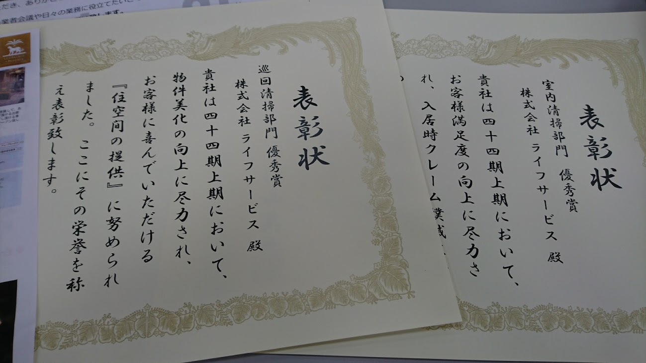 また、右側の「巡回清掃部門 優秀賞」と言うのは、当社エリア、北陸、岐阜で特に綺麗な物件だった業者を1社選定し、表彰されるものです。