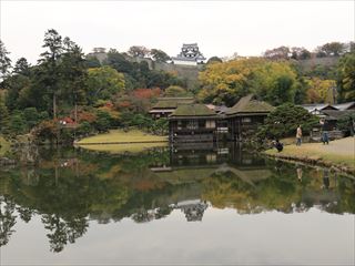 彦根城そばの庭園、玄宮園の池に写る彦根城。曇り空であまりうまく写っていません。