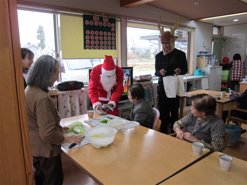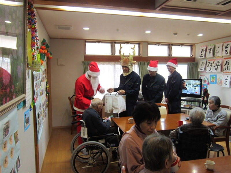 折しも12月。クリスマスが近いこともあり、サンタクロースの服を着て、お年寄りにお菓子をプレゼント。