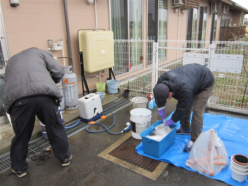 当日は雪の降り始めで、外でのファンやカバーの清掃は体の芯まで冷えました。