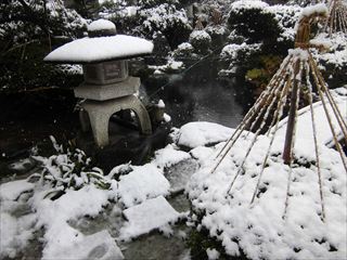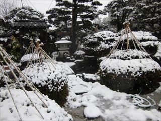 庭は雪吊りをしたツツジの上に積もって、雰囲気はもはや真冬のような感じになっています。