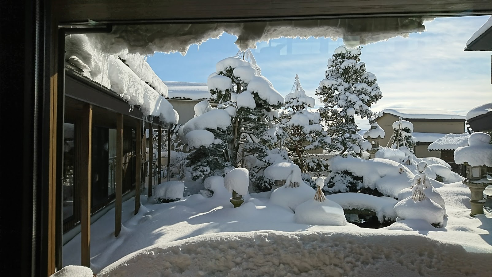 我が家の庭は雪だらけ。前の雪山は屋根から落ちて来た雪です。